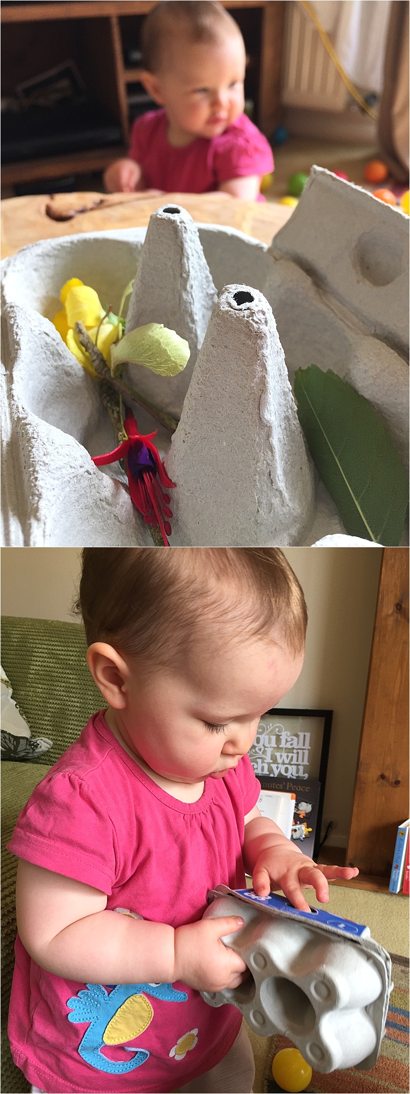 Neive has LOVED all the time outside over the last few weeks (lets hope for more sun though) and has been very keen to touch all the plants and flowers. I made up a little nature egg box for her to discover the other day and it was a hit, the egg box just as much as the flower, stick and leaves.