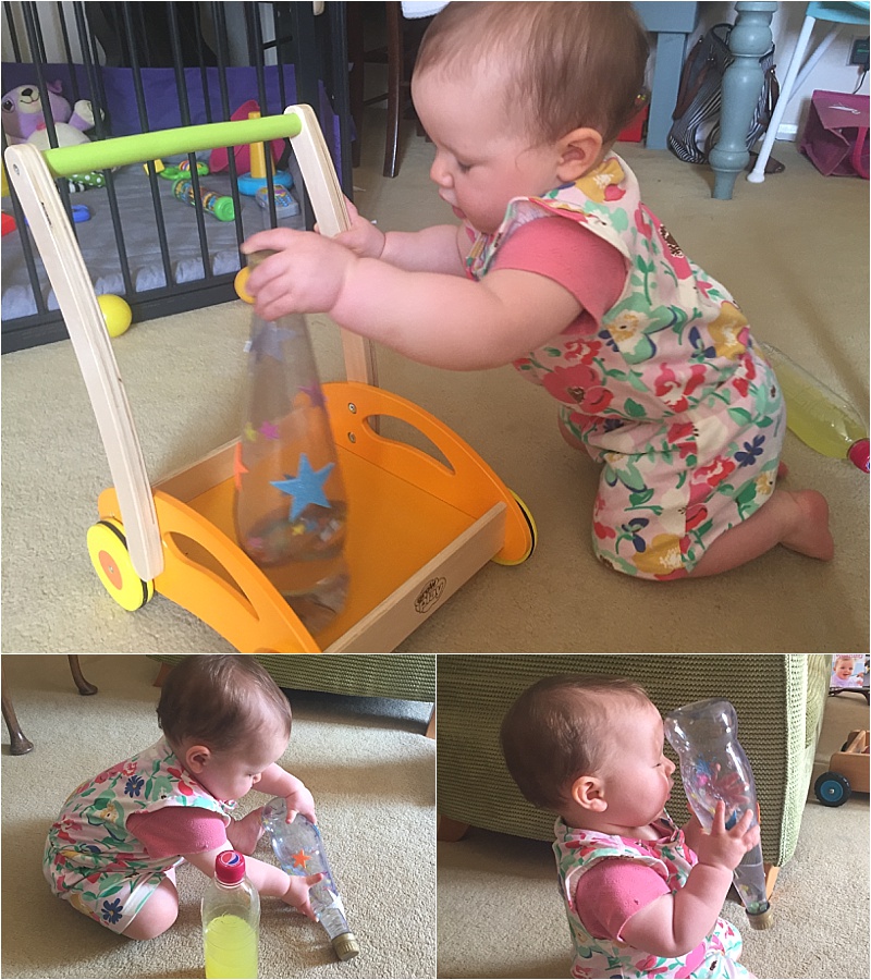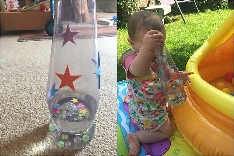I got this idea because Neive loves to shake marks Pepsi bottle around. I part filled one of the Pepsi bottles with water and a drop of food colour and one larger one with water, beads and star stickers.