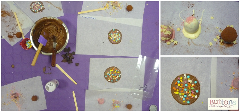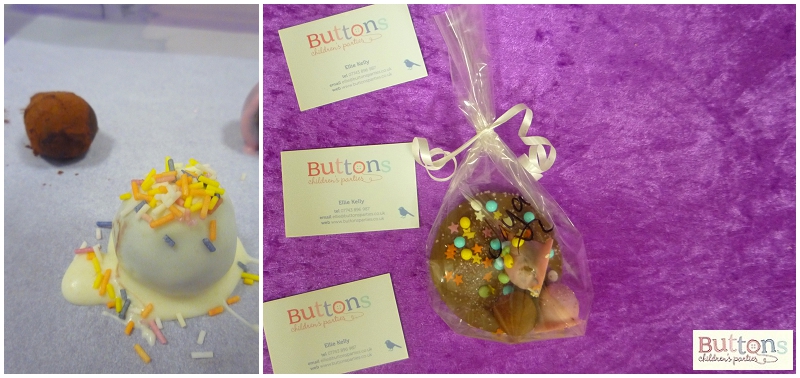 Whilst the children had there party food and some much needed carbs after all the finger licking, we popped the chocolate buttons (back out of the fridge) and truffles into little cello bags ready for them to take home.