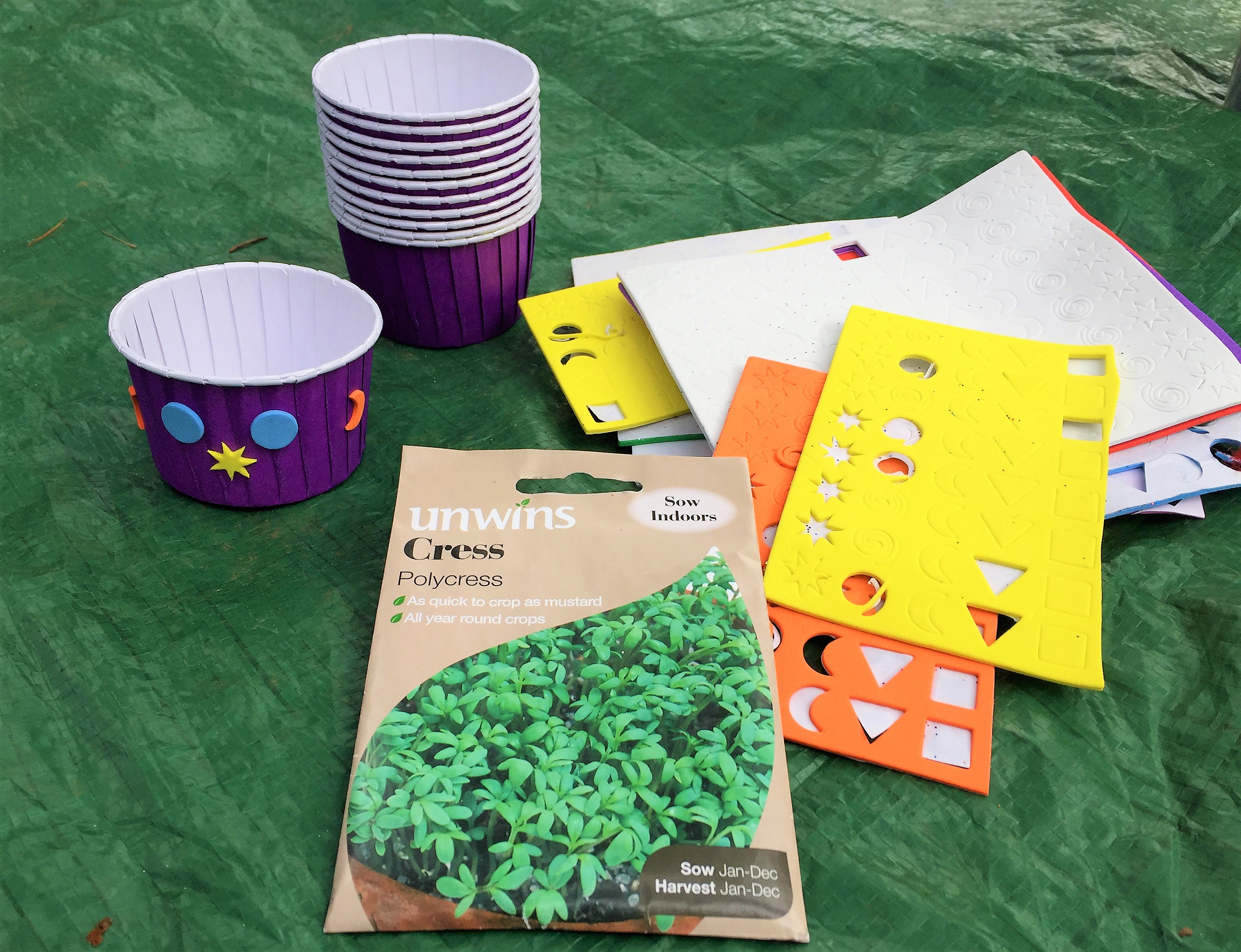 - Something to plant the seeds in. These are muffin cases (with a water resistant coating inside) but you could also use egg shells or yogurt pots