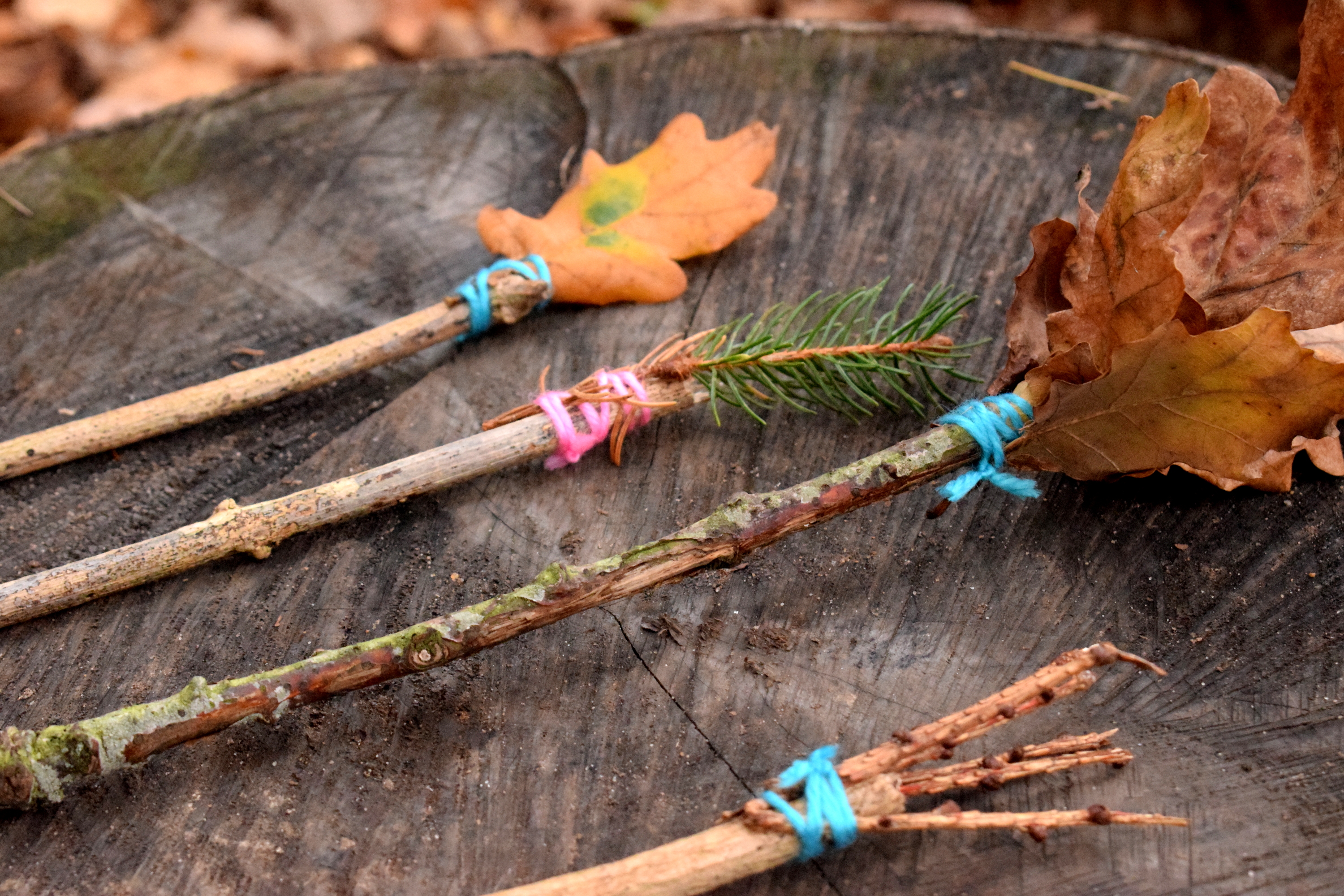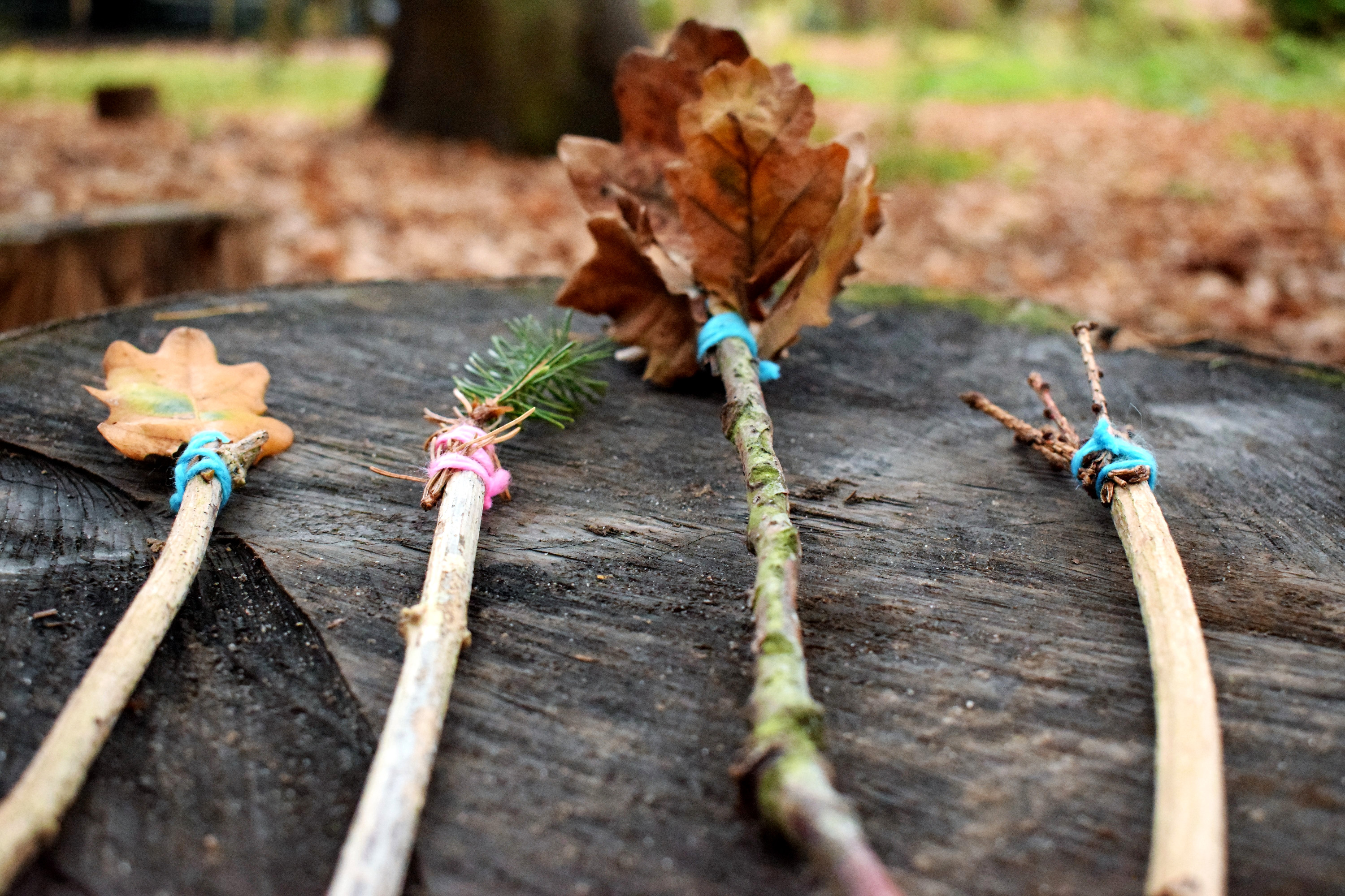 We got collected four little sticks and some good tickle items such as leaves, pine needles and other little branches and while wandering around tied them to the ends of the sticks.