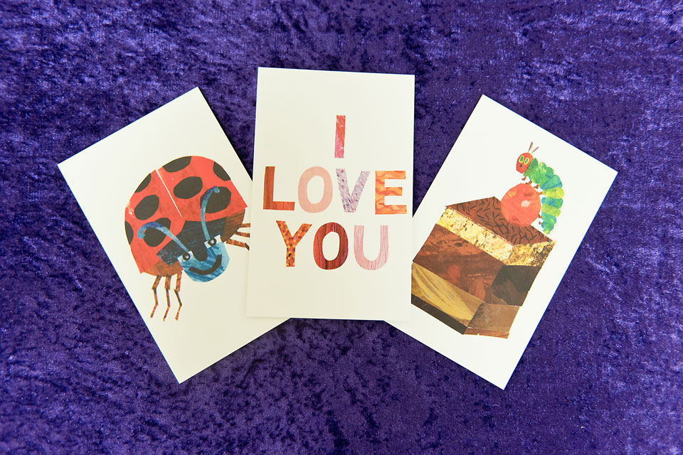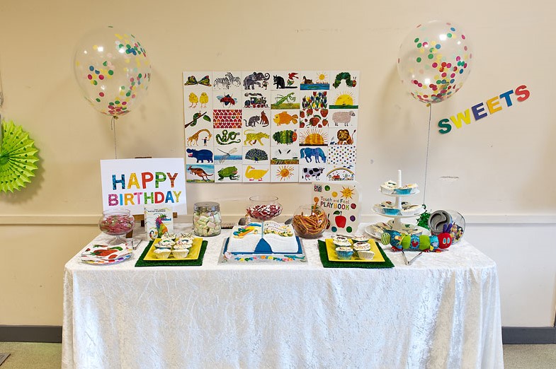 I set up the cake table as the main feature and with a box of 100 Eric Carle postcards I purchased online I made a back drop. I also used the cards to make signs and posters as well as the thank you tags.