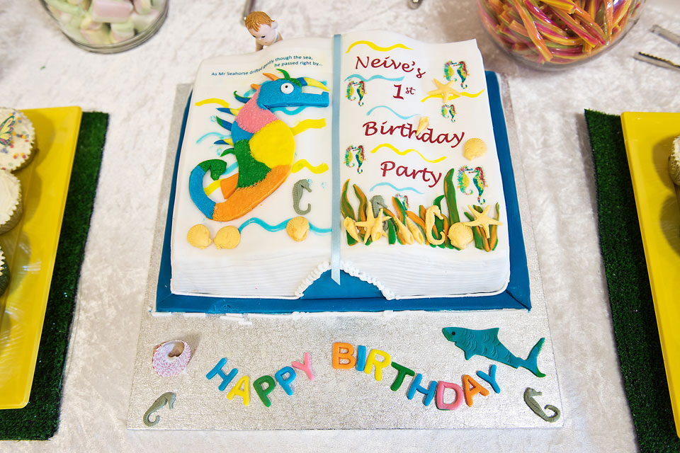 Neive’s cake was a book cake decorated to look like the open pages of Mr Seahorse, an Eric Carle book we have. It read “As Mr Seahorse drifted gently though the sea he passed right by Neive’s 1st Birthday Party”. Mark (aka Mr Kelly) made a little Neive model who was stood on some books at he back of the cake looking over. Can you see her in the pic above and below, so cute.