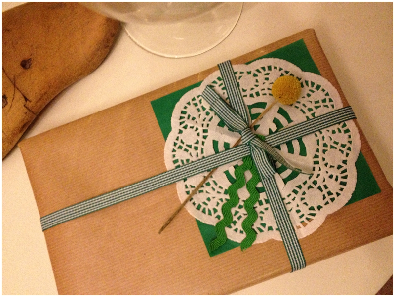 This present started with my staple brown craft paper, followed by a square of green tissue