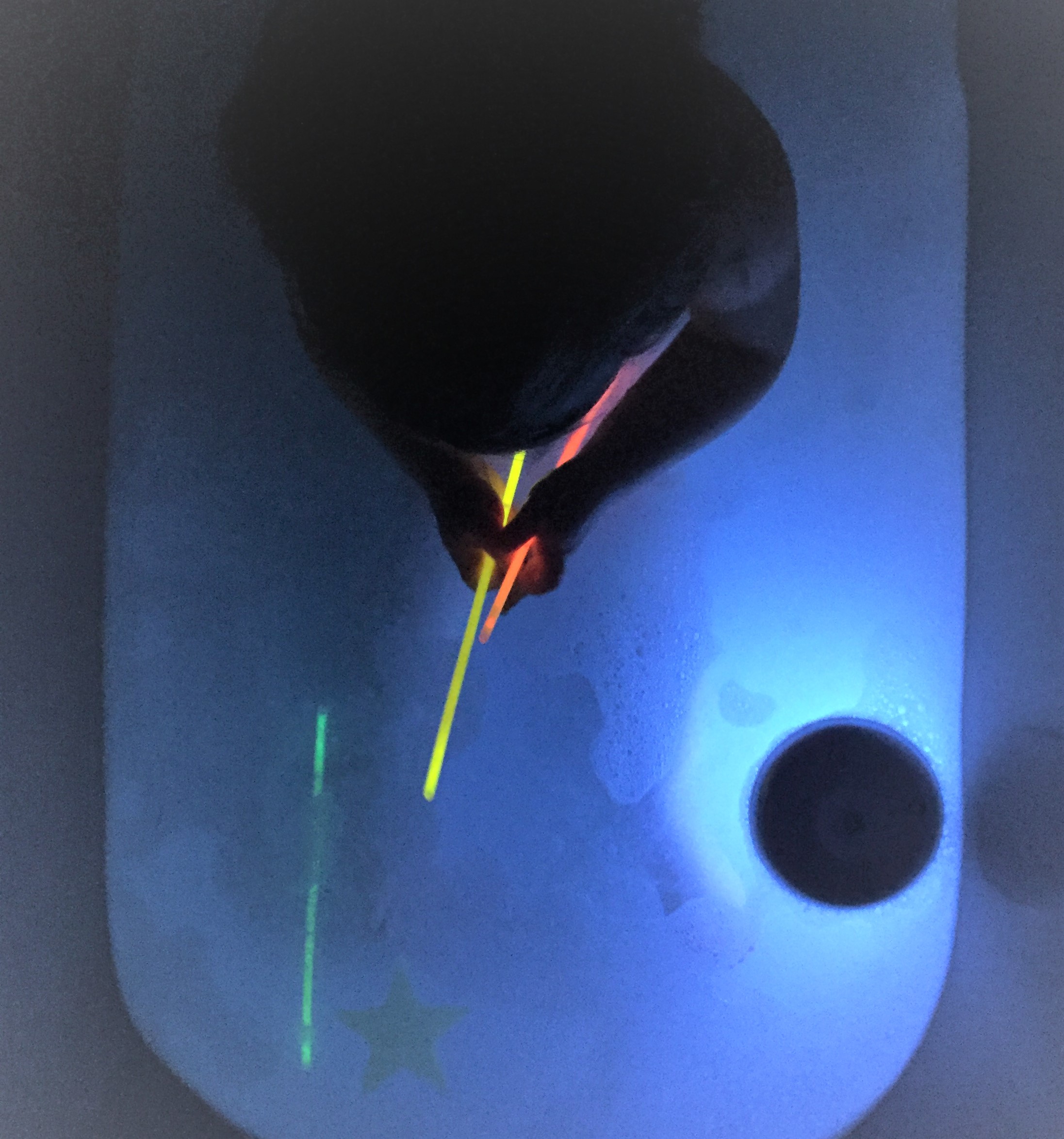 I have done a glow stick bath before but thought I would up my game. I did some on line searches and found a post from Growing a Jeweled Rose who has done lots of glow bath play. I didn’t fancy the glow water just yet so I planned to put some glow sticks in the bath along with a floating colour changing light, add glowing stars to the wall and I got some glow in the dark paint and mixed it with some shaving cream as per one of posts I read.