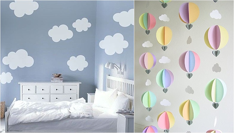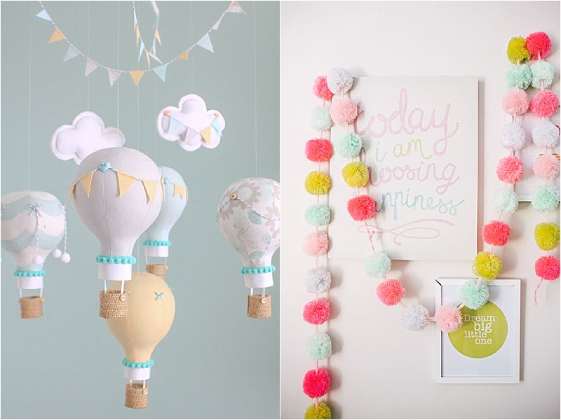 The main colours will be soft green, purpley pink and blue as below and the theme will be clouds and hot air balloons.