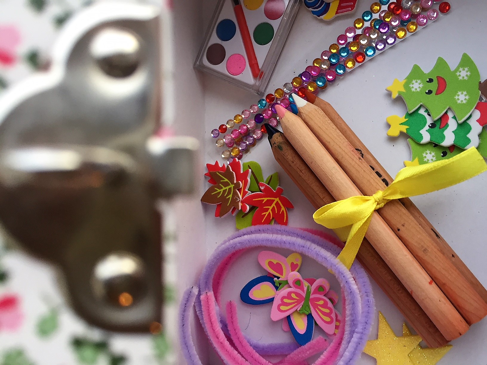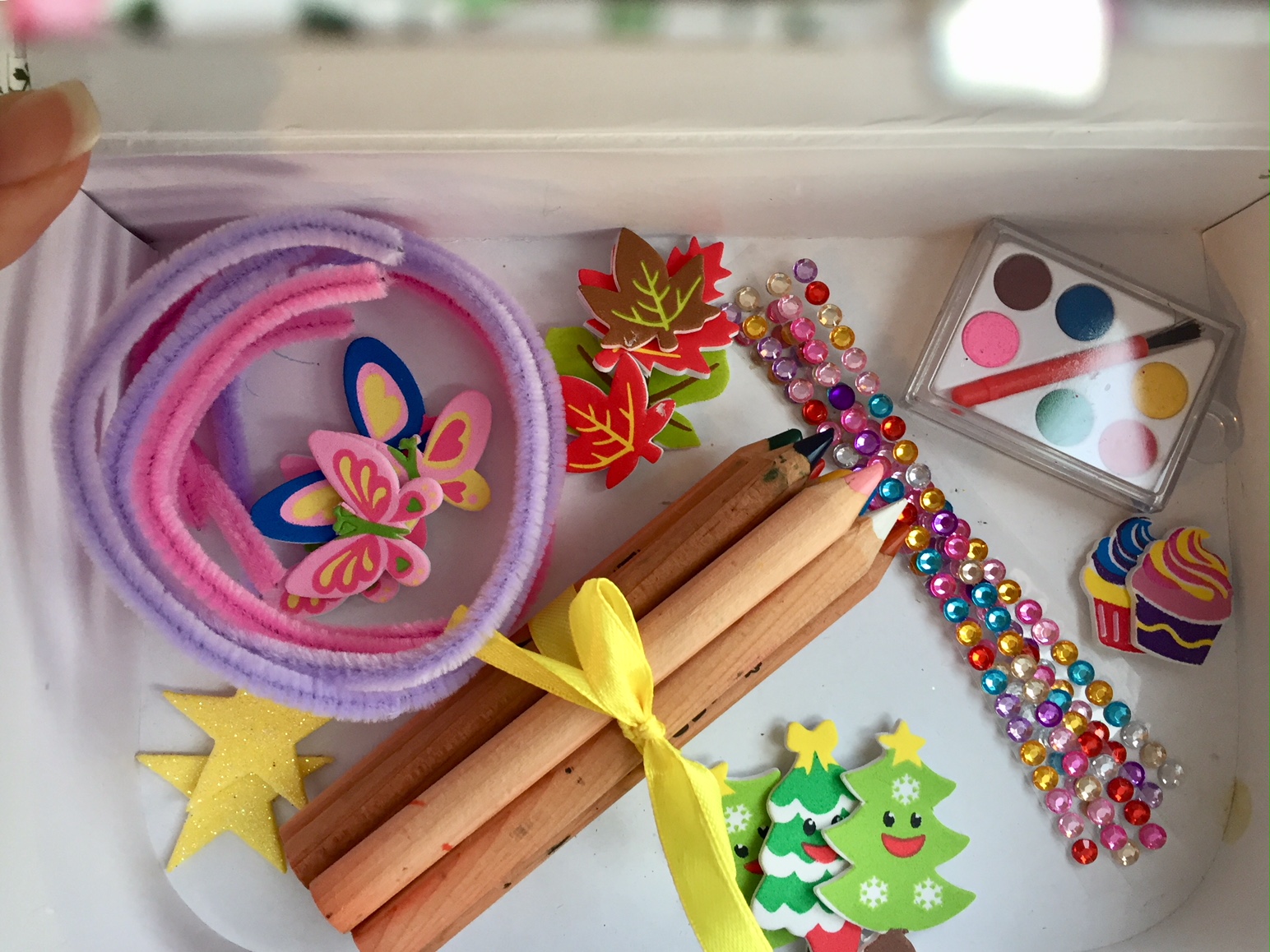I didn’t buy anything new for this. I used a little suitcase we already had and raided the craft draws to fill it with colouring pencils, stickers, gems and colourful pipe cleaners.