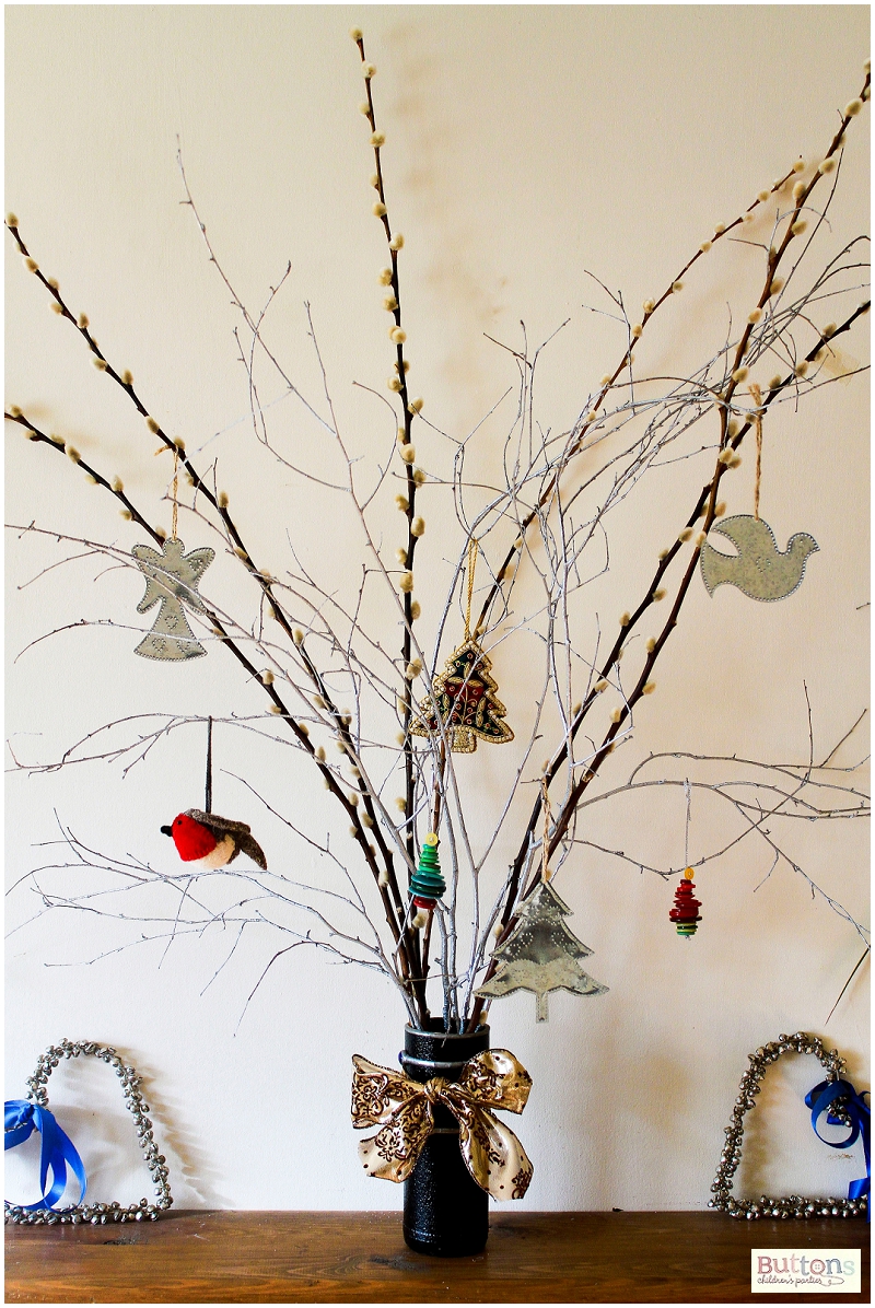 It really is so simple. I collected some of the lovely thin branches from the garden and sprayed them sliver (and quite a lot of the grass, so be careful of that bit) and then popped them into a tall vase which I had decorated with ribbon. I then hung some of my new 2012 decorations on it. I already had some pussy willow which I added to the mix but If you don’t have anything to mix in, the branches look lovely on there own.